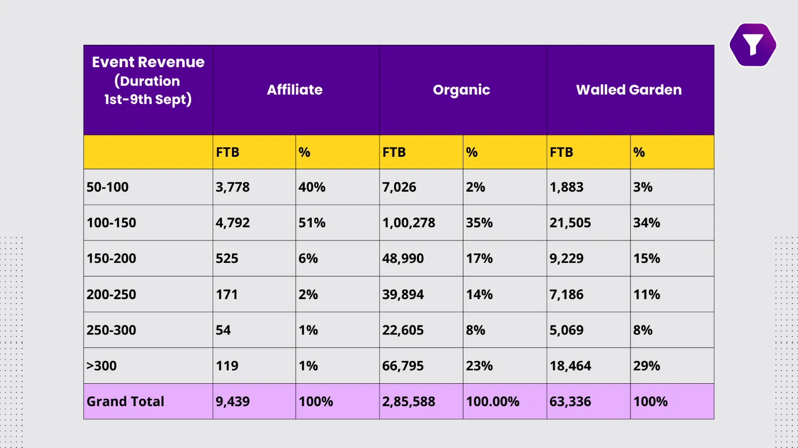 For instance, in arbitrage cases, publishers pay users an amount less than what they earn from the brand. 40% of events from affiliates had ticket values between ₹50 – ₹100, while in the case of Organic and Walled Gardens, only 2% of events with such low-ticket values occurred. However, for ticket values above ₹300, the percentage of contribution from affiliates drops drastically to 1%, with organic sources contributing 23% and walled gardens 29%. This clearly shows that higher-quality users are more prevalent in organic and walled garden sources compared to affiliates.